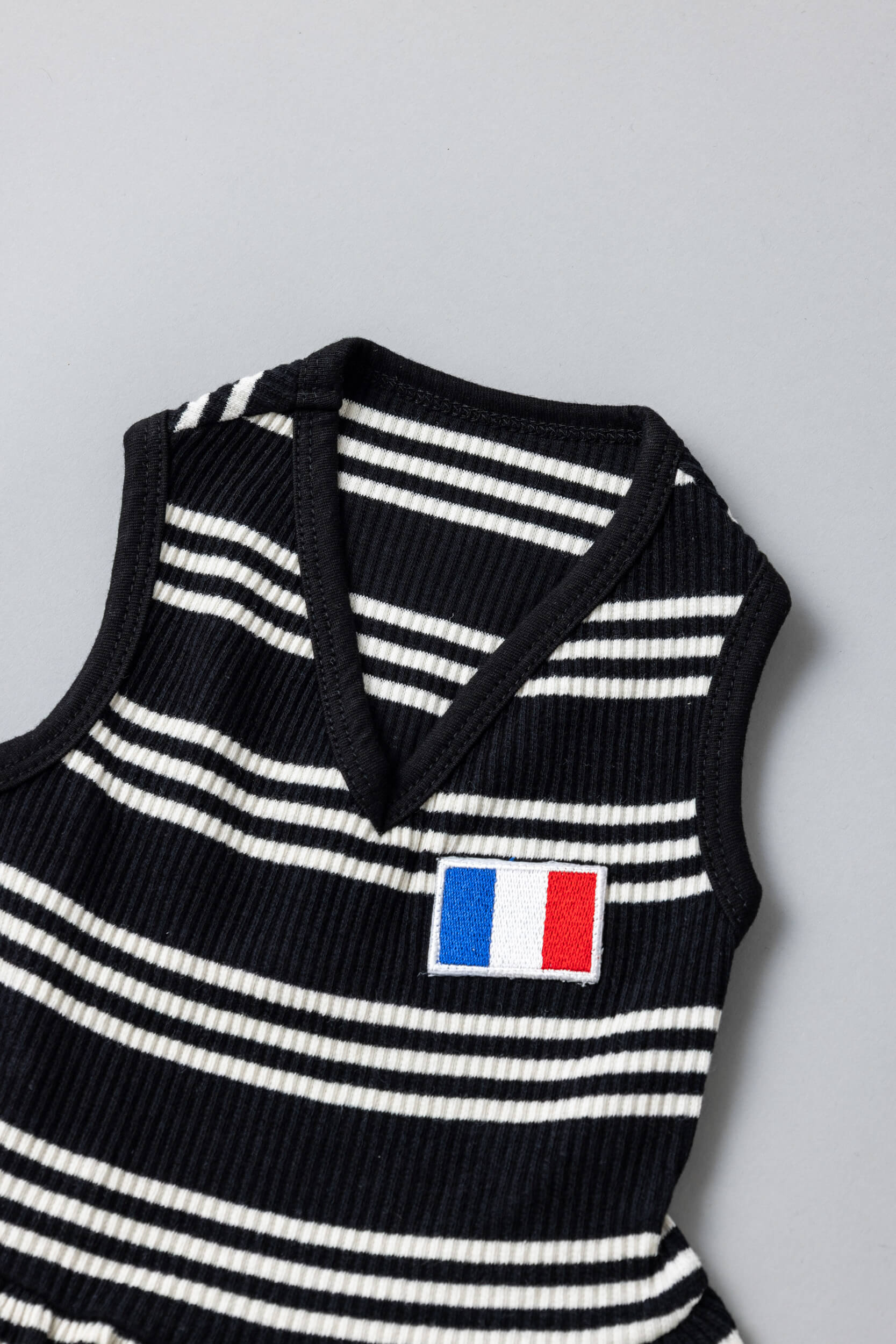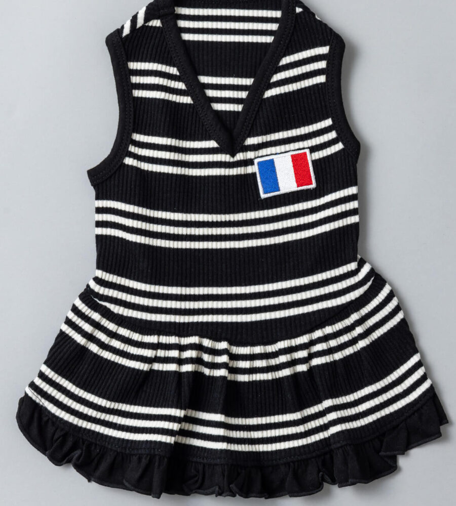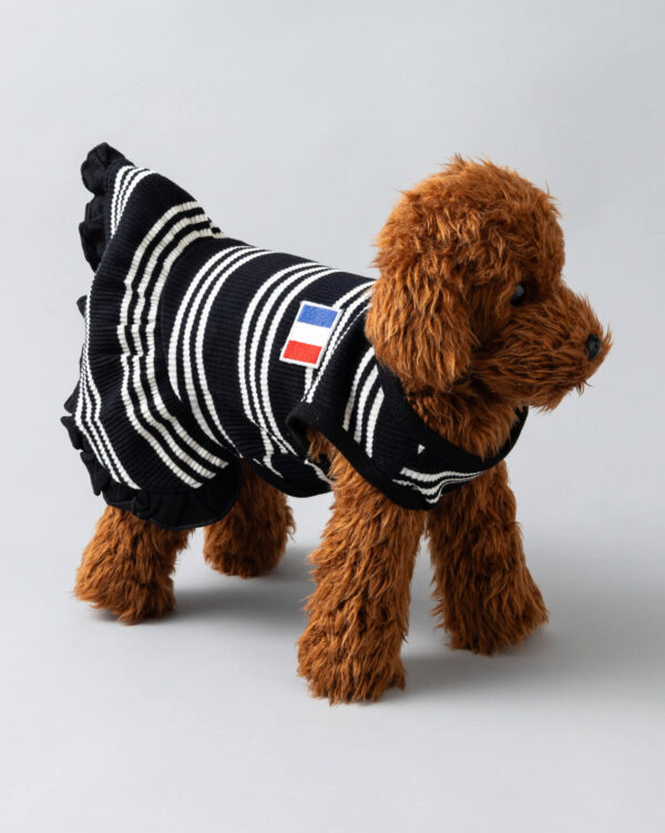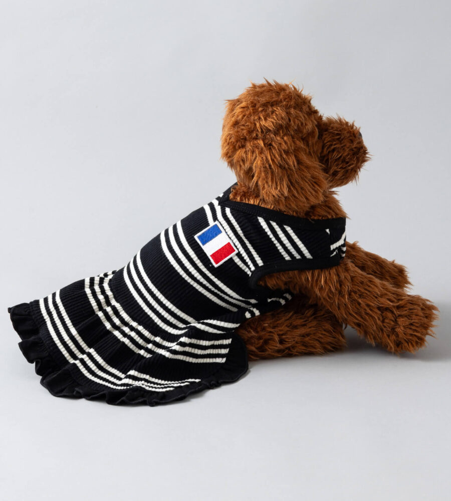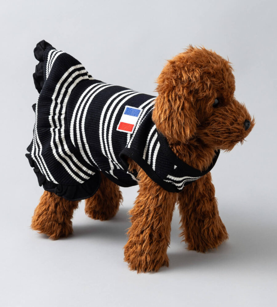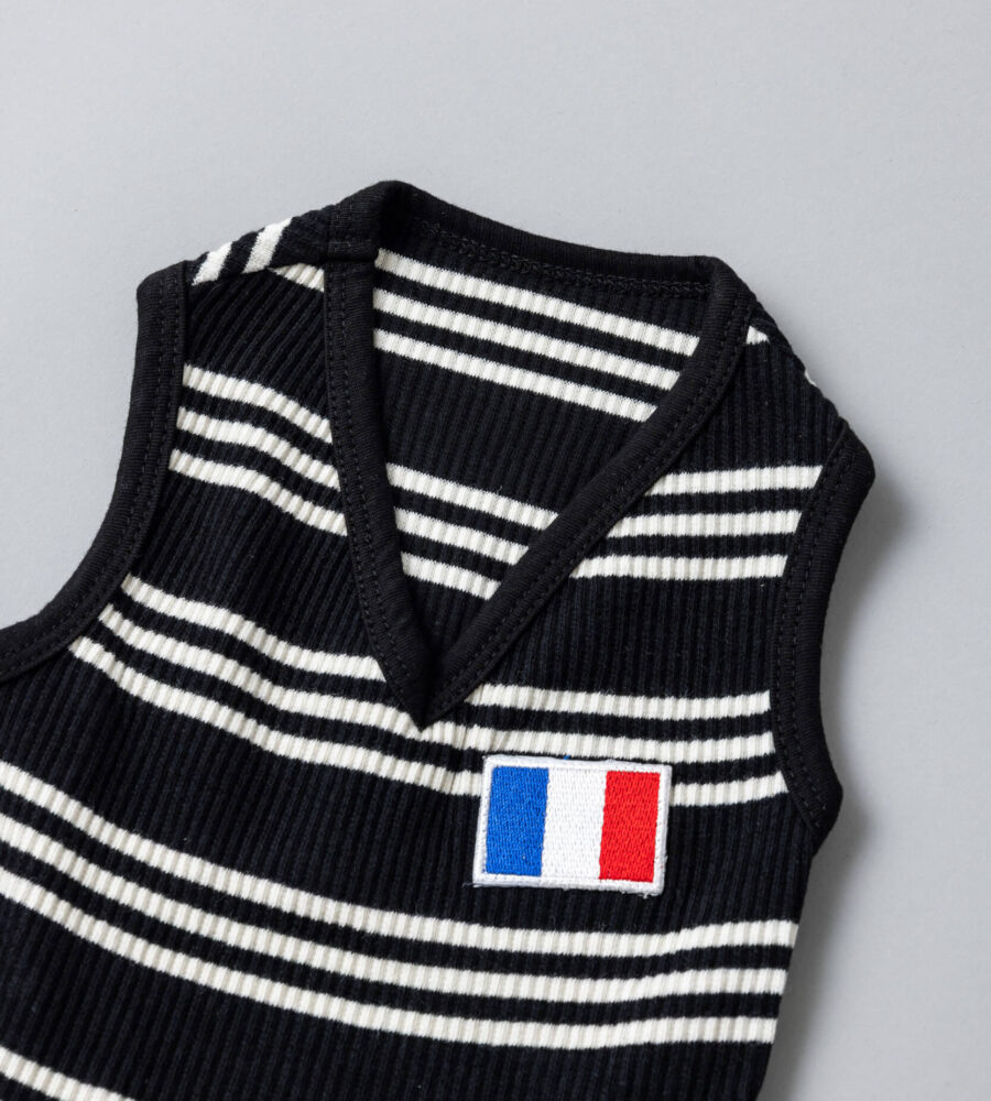 モノトーンのストライプに胸元のフランス国旗のフレンチパッチがポイント。