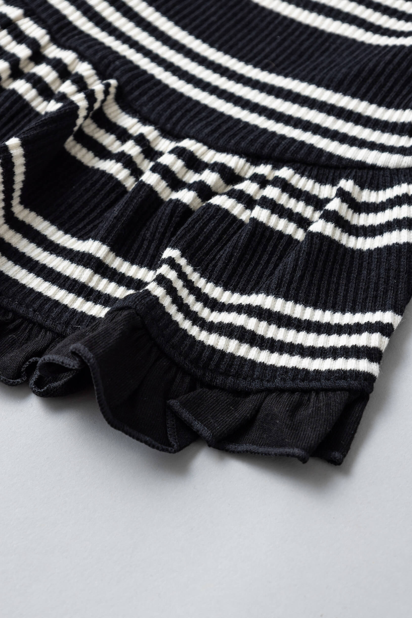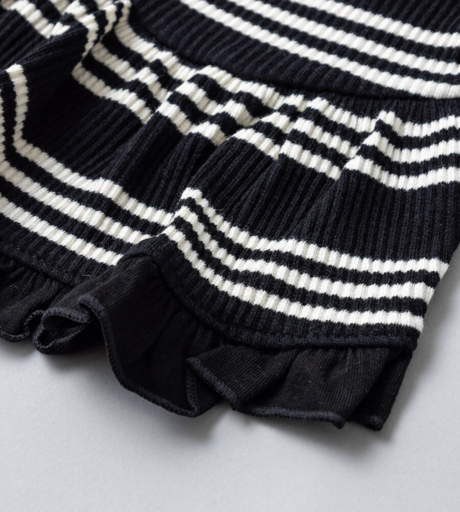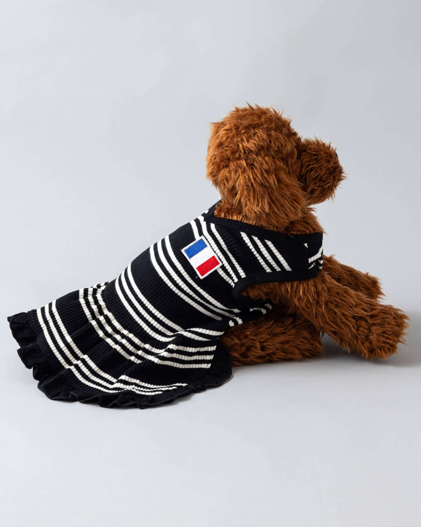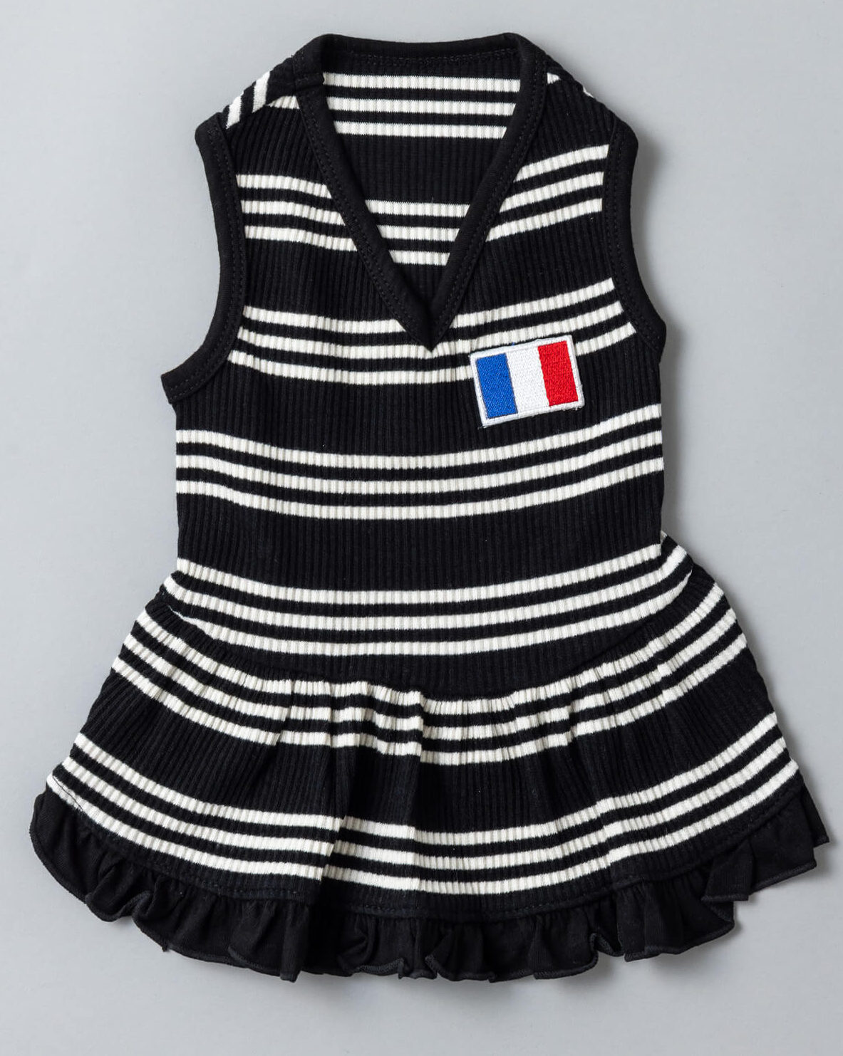 モノトーンのストライプに胸元のフランス国旗のフレンチパッチがポイント。