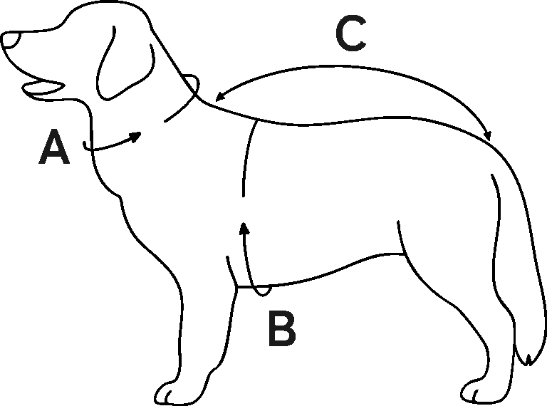- A 首まわり B 胴まわり C 着丈