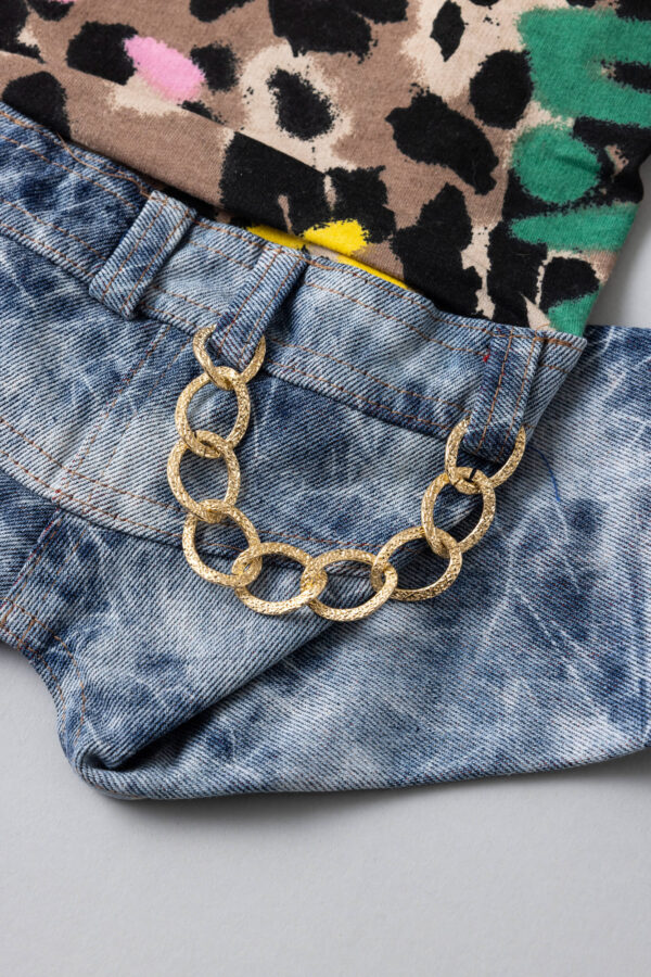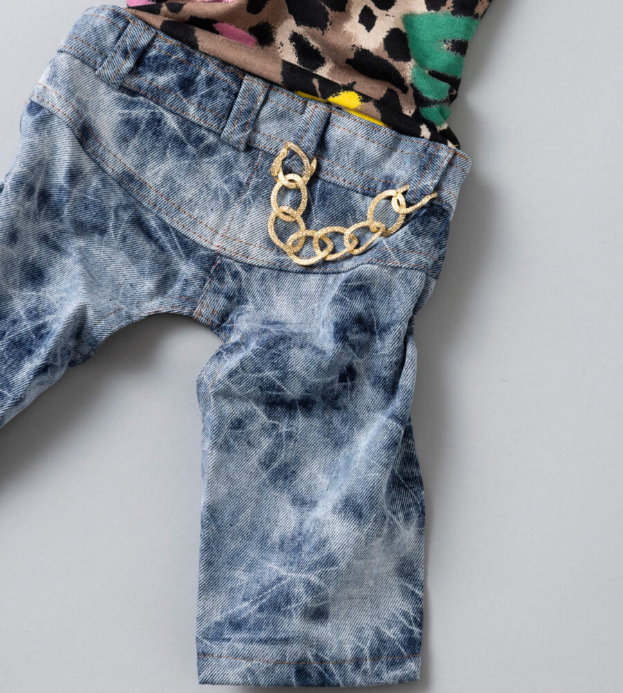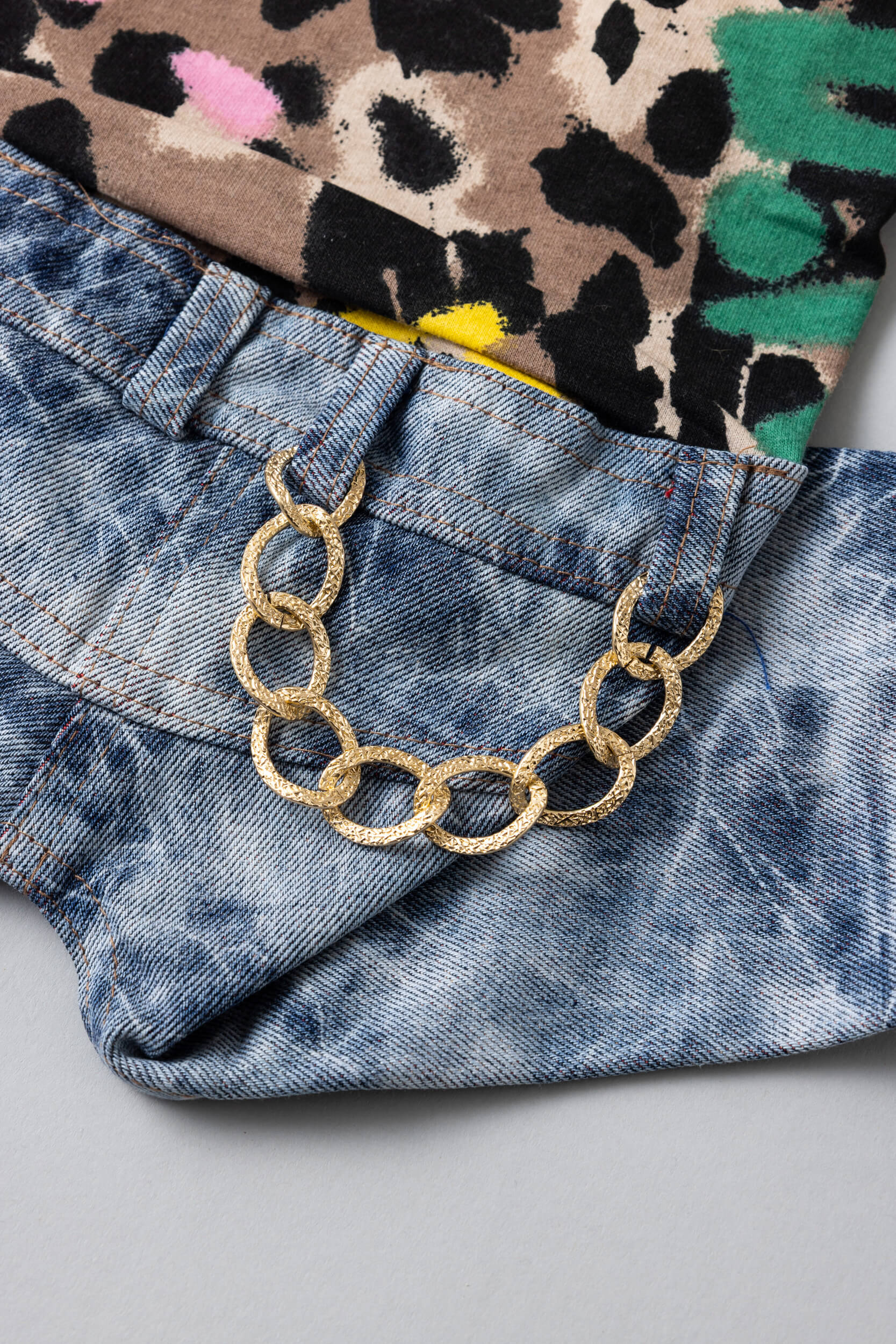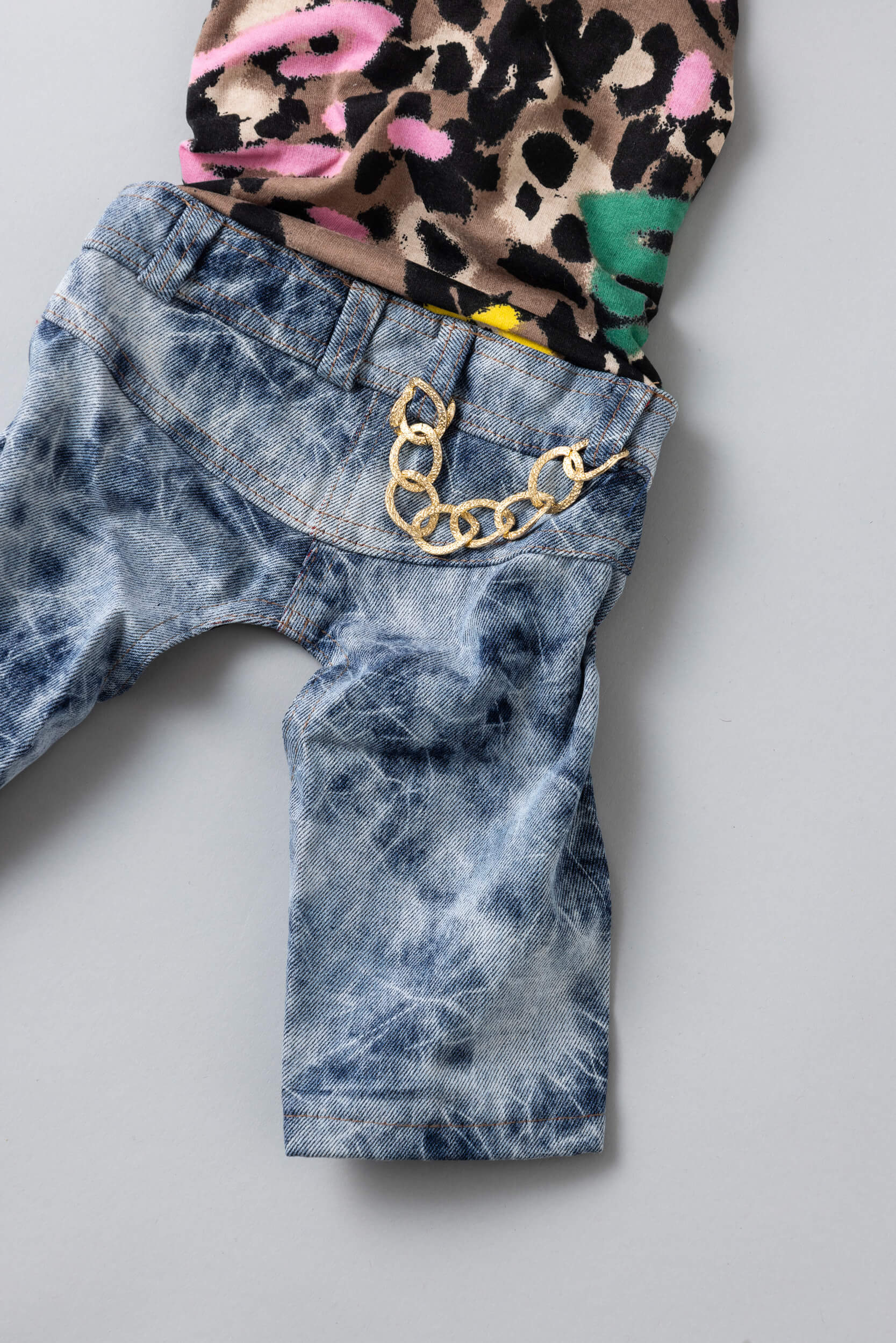 鮮やかなレオパード柄トップスに、ビンテージ加工のデニムパンツを組み合わせた個性派デザイン。