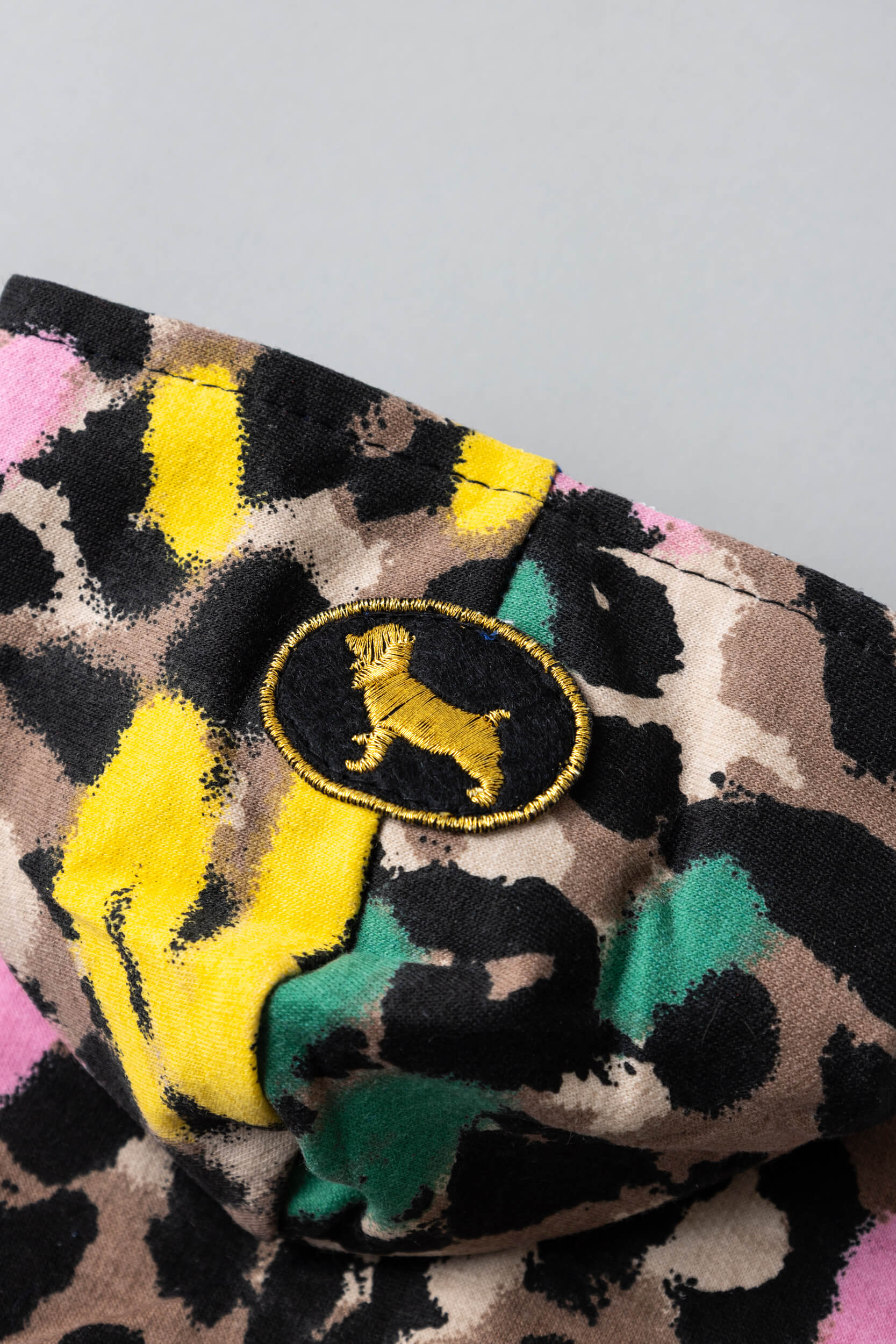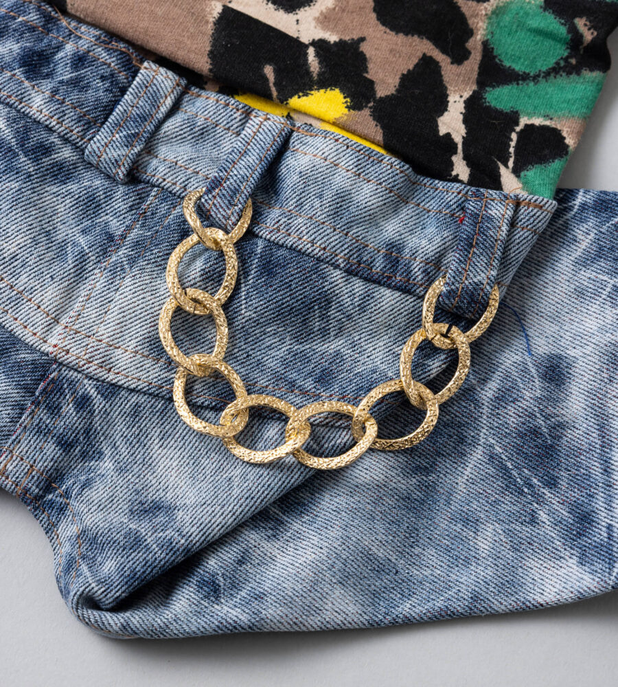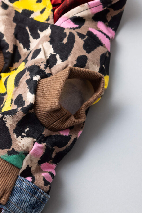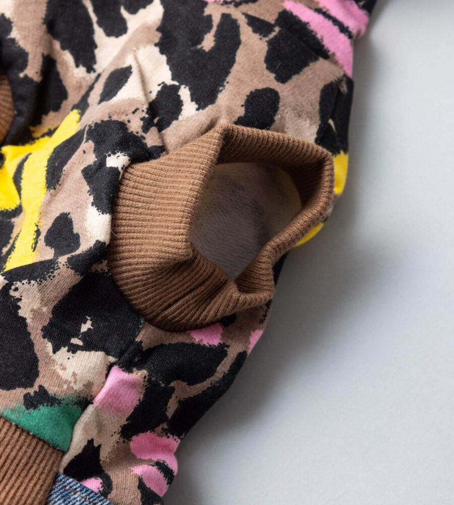 鮮やかなレオパード柄トップスに、ビンテージ加工のデニムパンツを組み合わせた個性派デザイン。