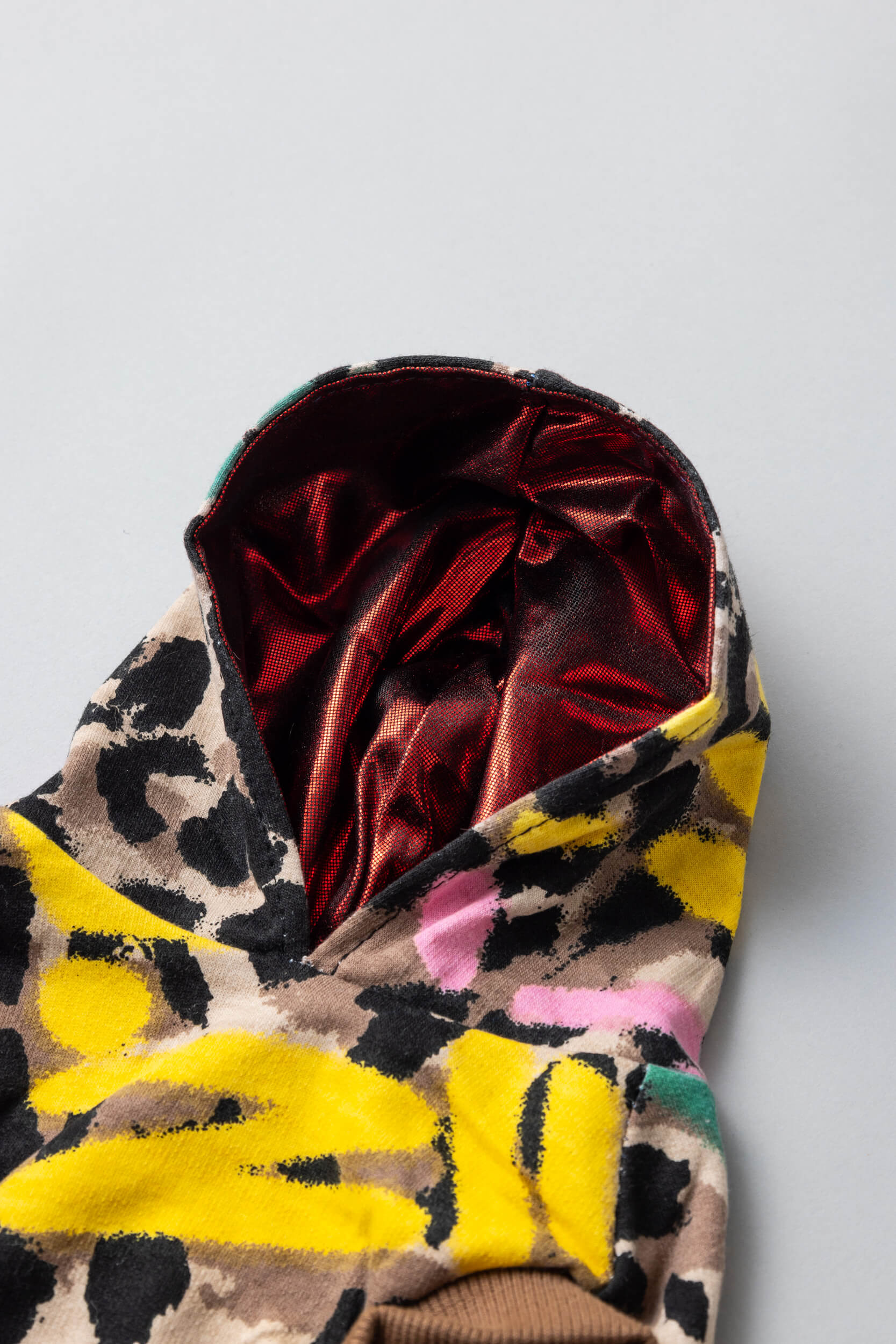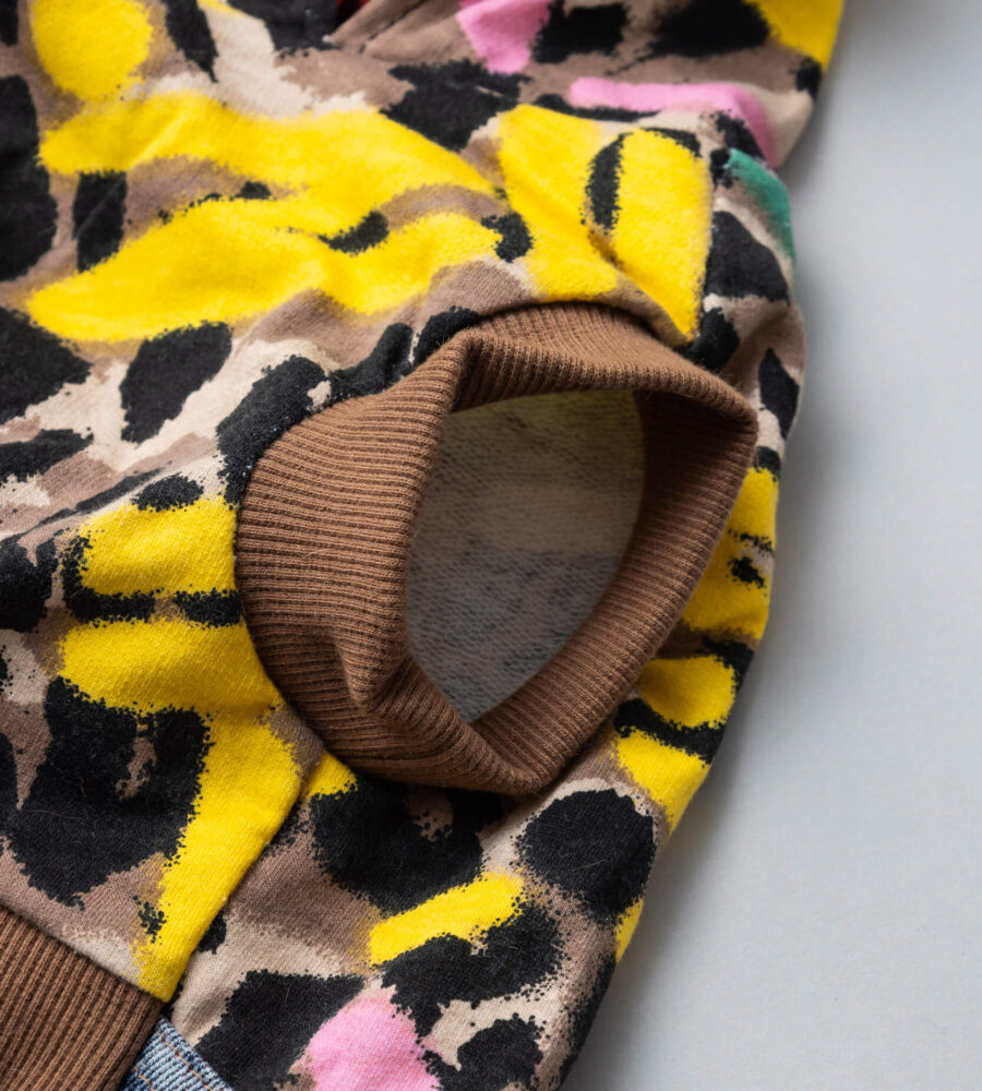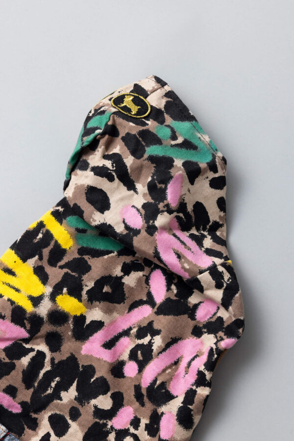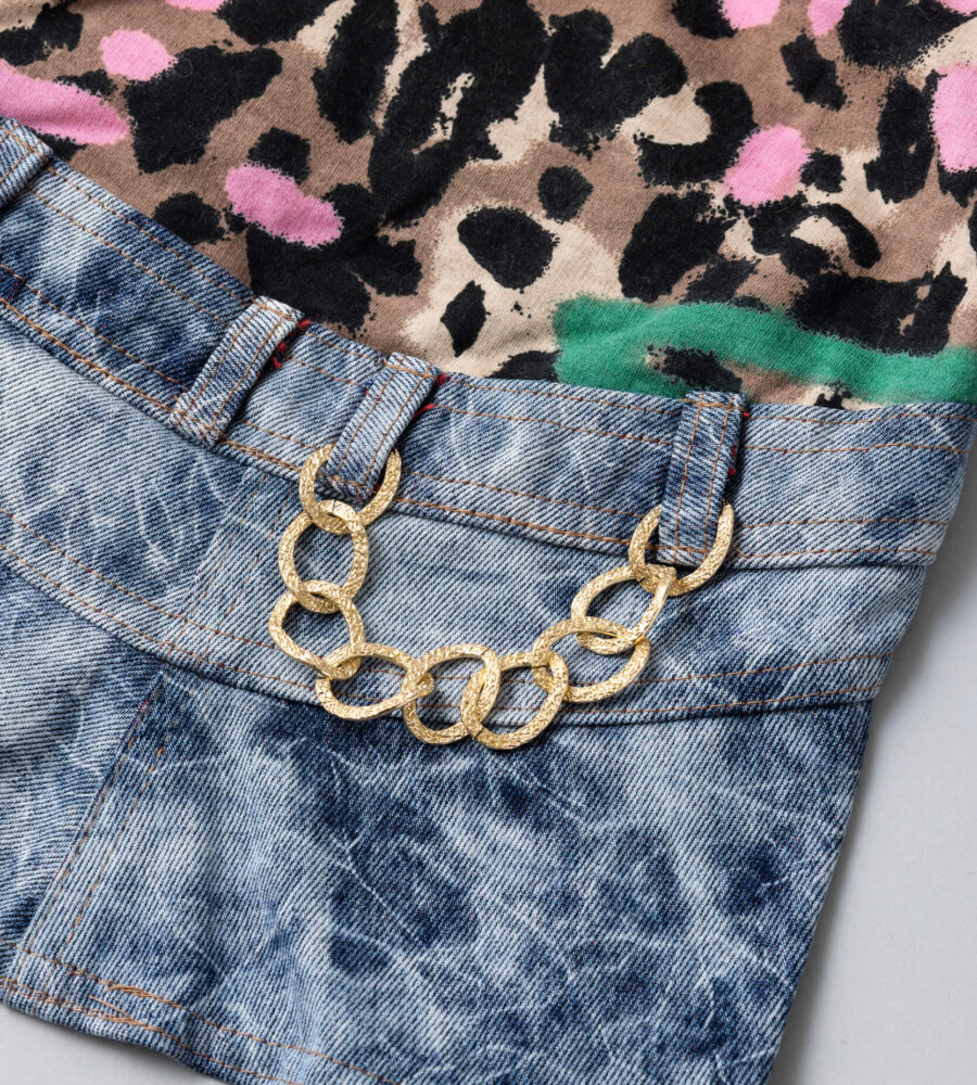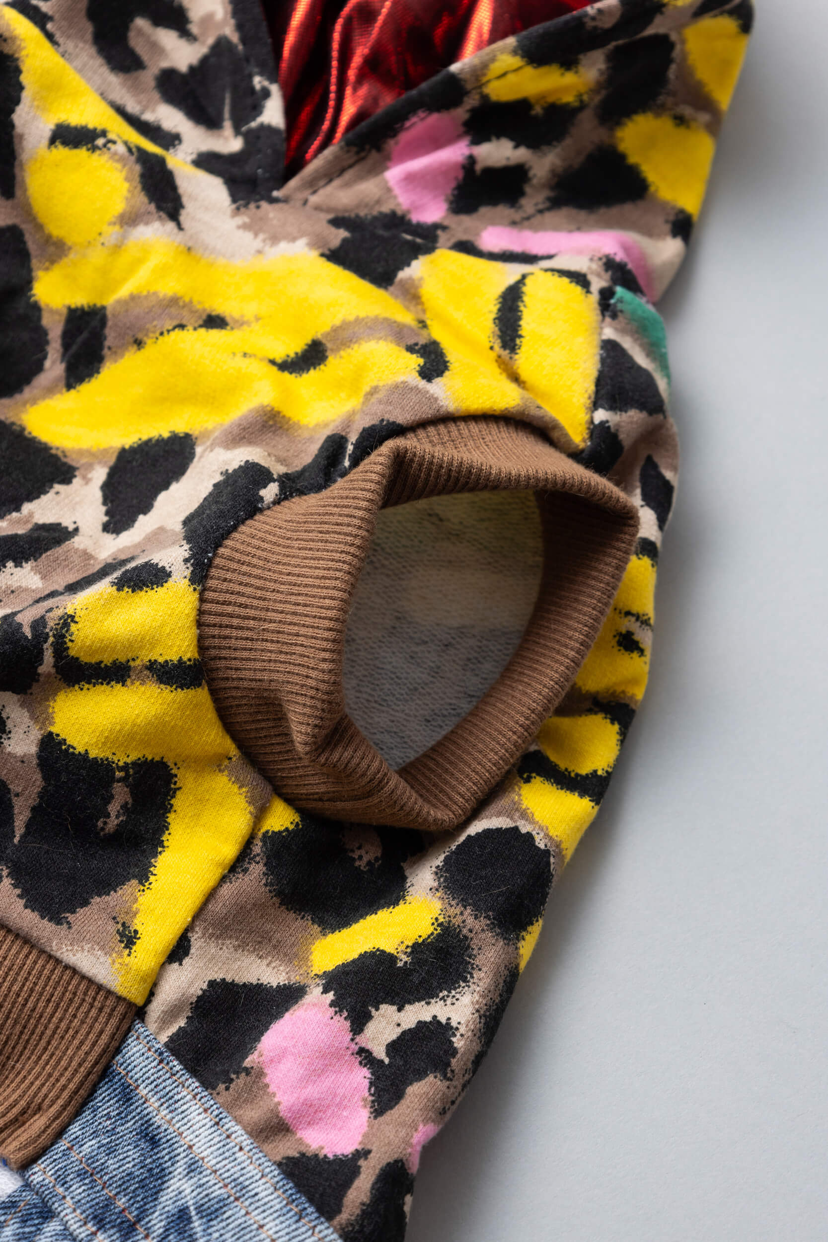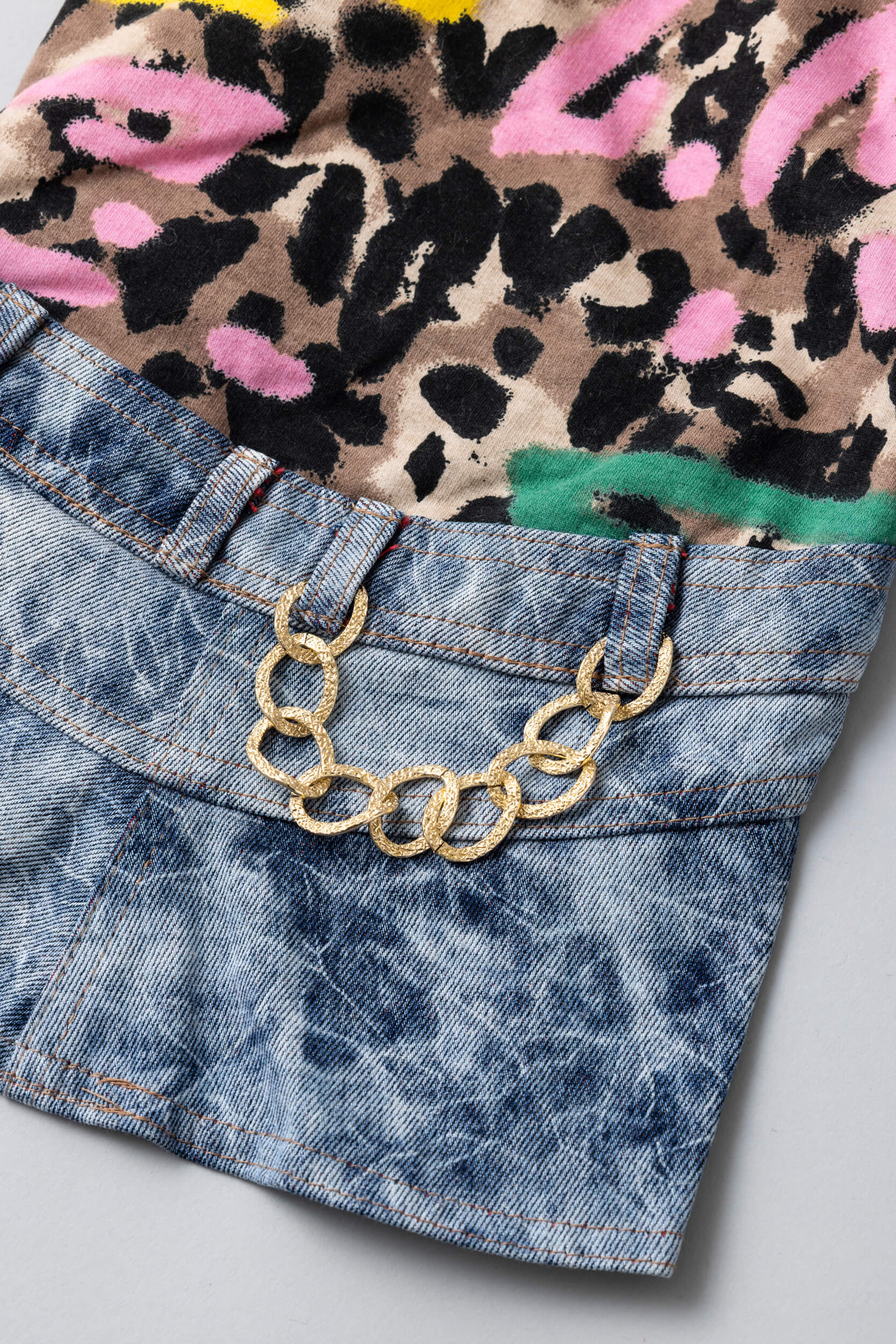 鮮やかなレオパード柄トップスに、ビンテージ加工のデニムパンツを組み合わせた個性派デザイン。