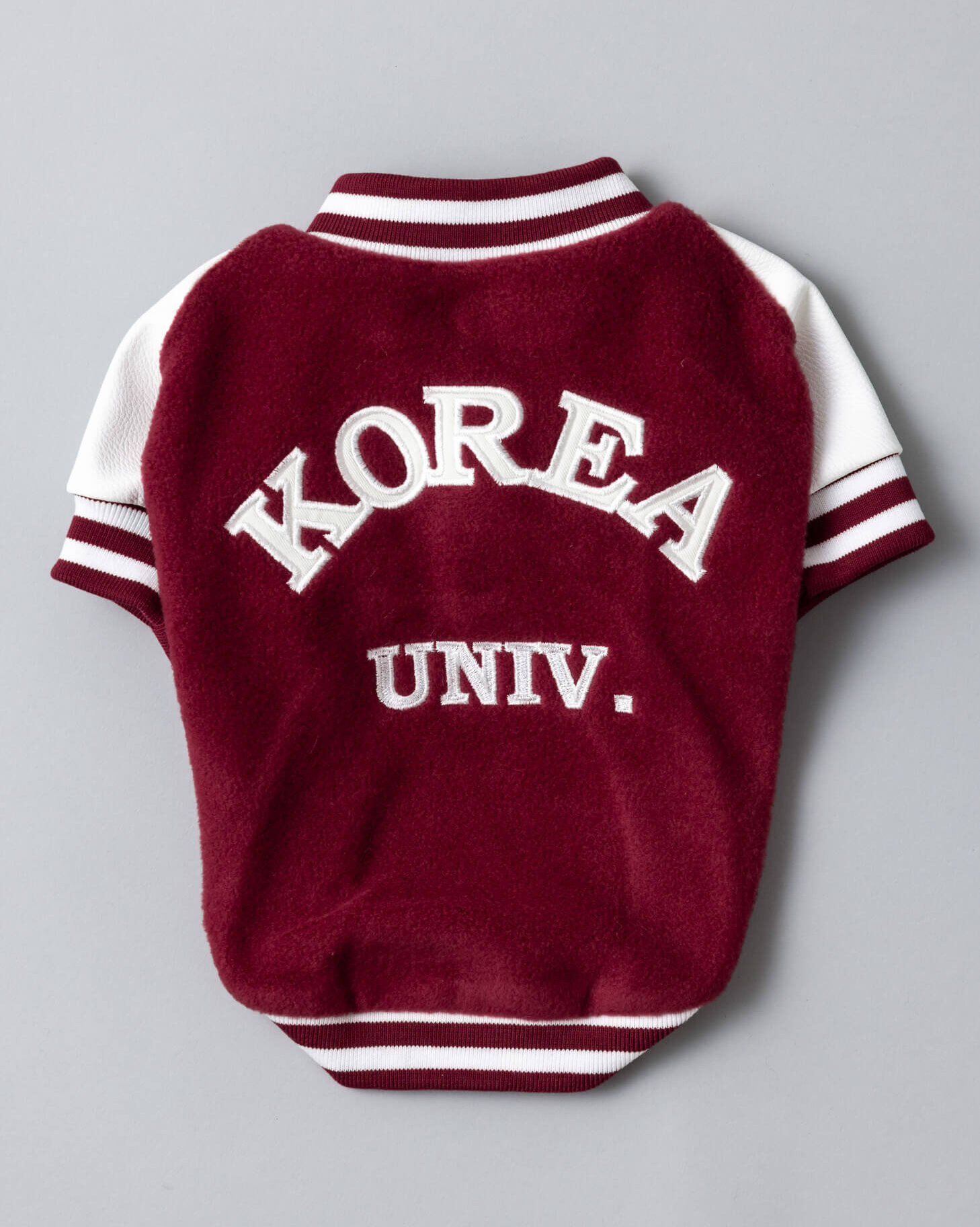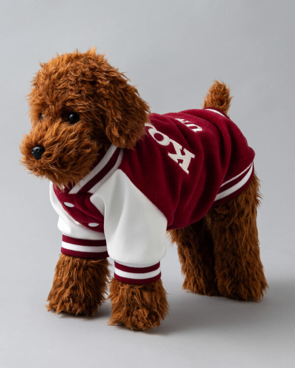 レッド×ホワイトのカレッジデザインが印象的な、スポーティで上品な犬用トップスです。