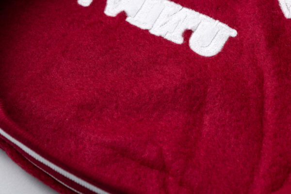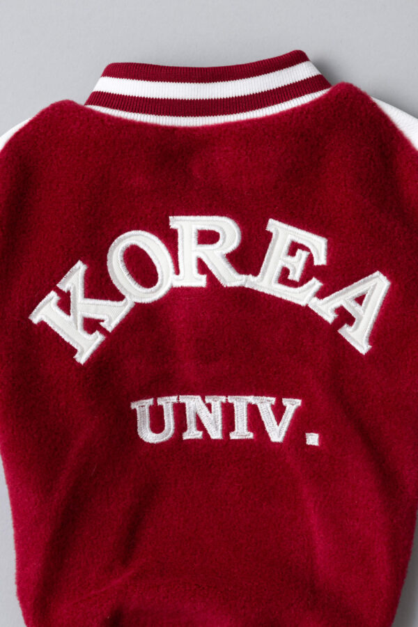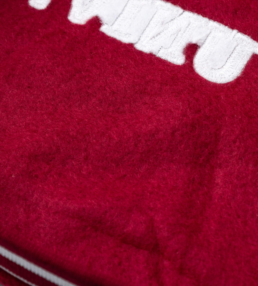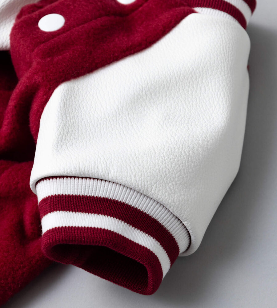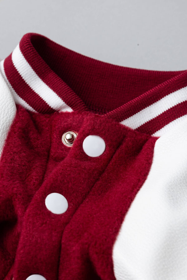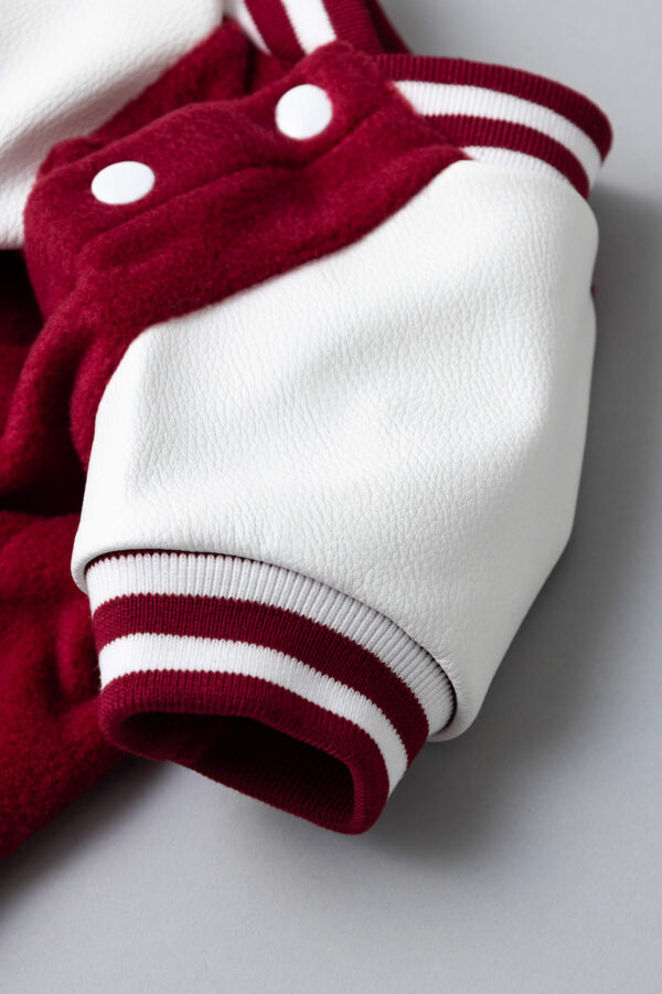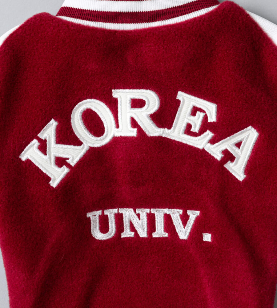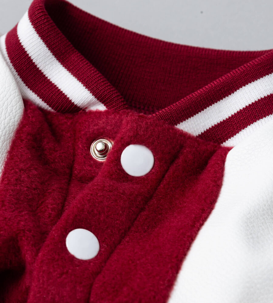 レッドの柔らかな起毛素材をベースに、ホワイトのスリーブと配色ラインを組み合わせたカレッジテイストのデザインです。