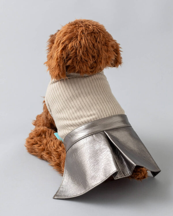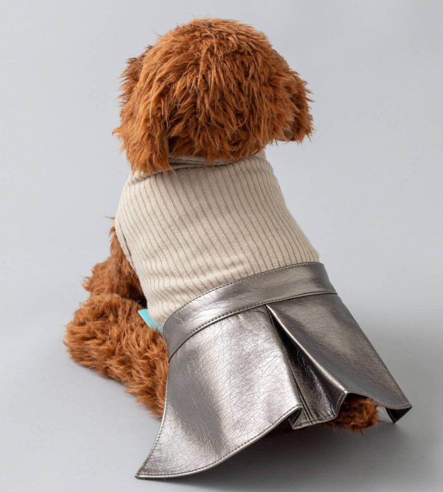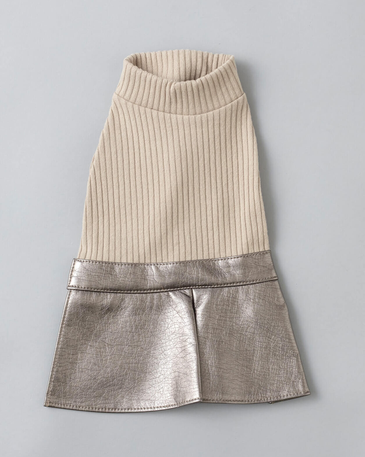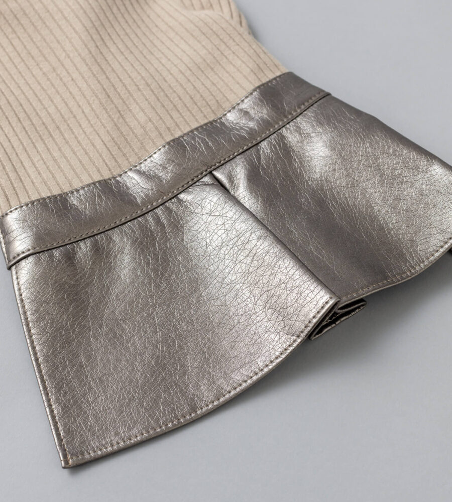 クラシックなベージュカラーのリブ素材にトレンド感あるメタリックスカートをドッキング。