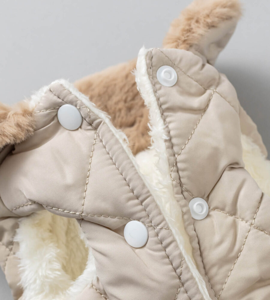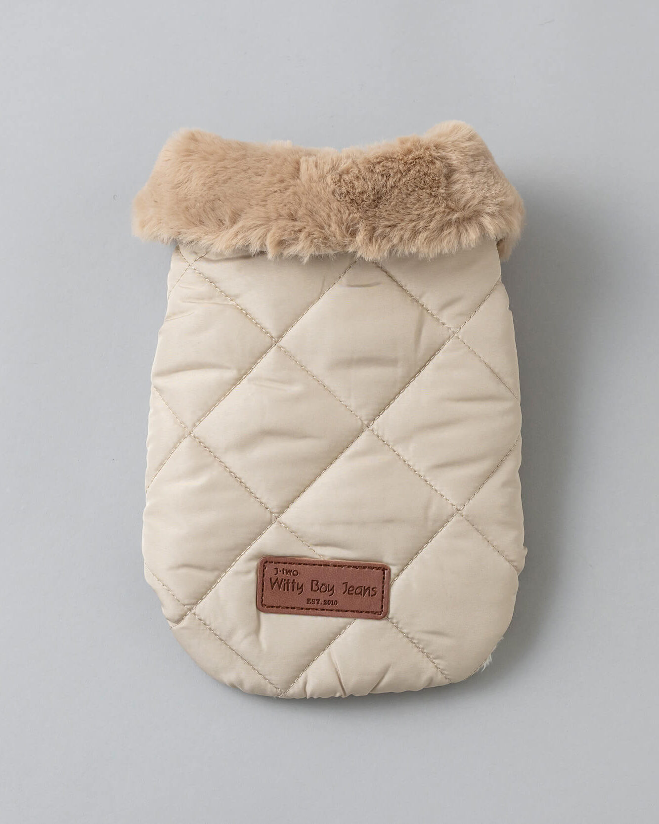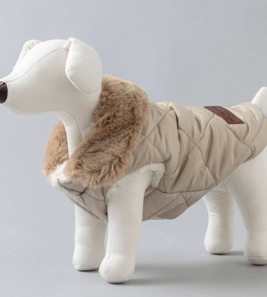 やわらかな光沢感あるキルティング素材に襟元のフェイクファーがリュクスな雰囲気をプラス。
