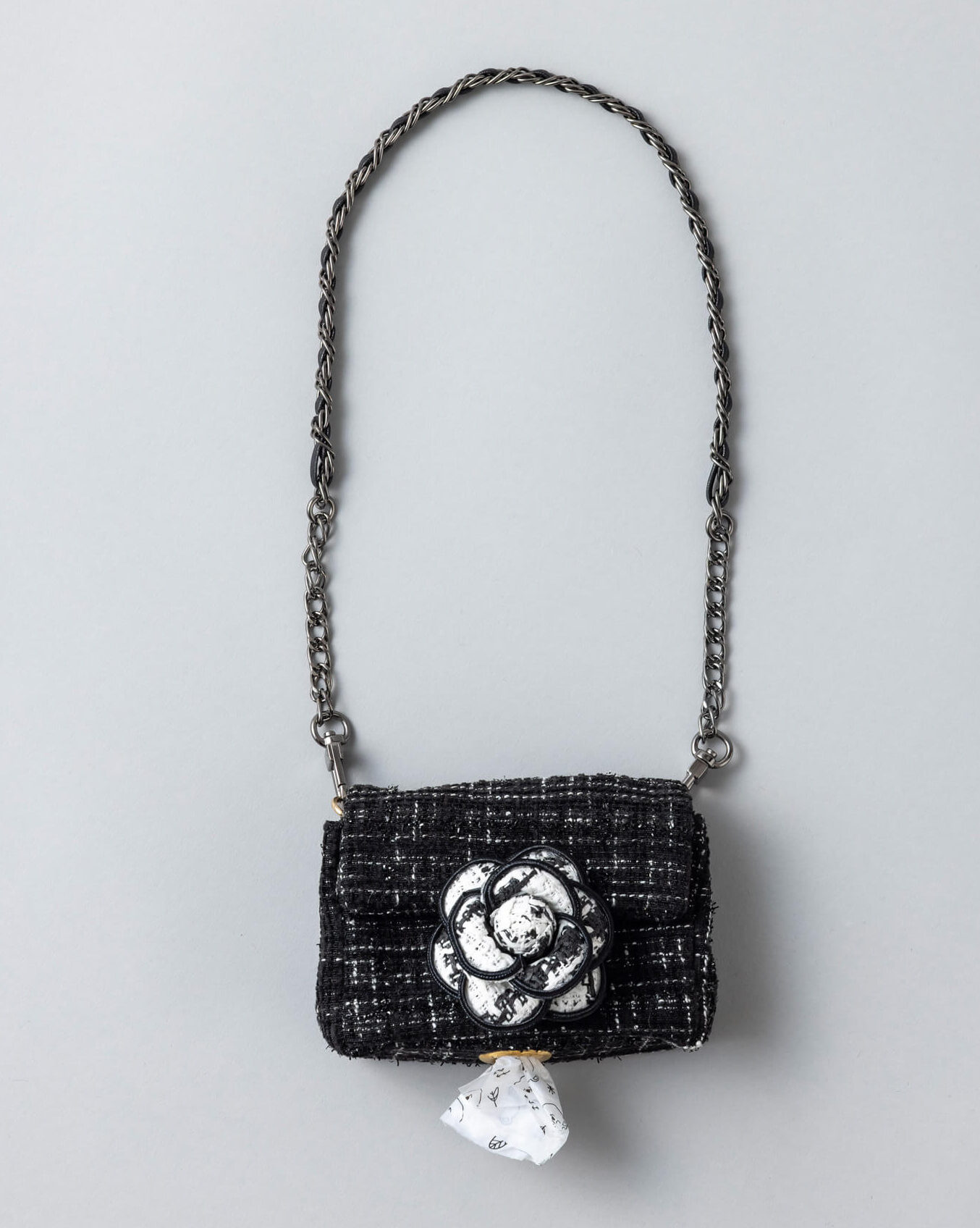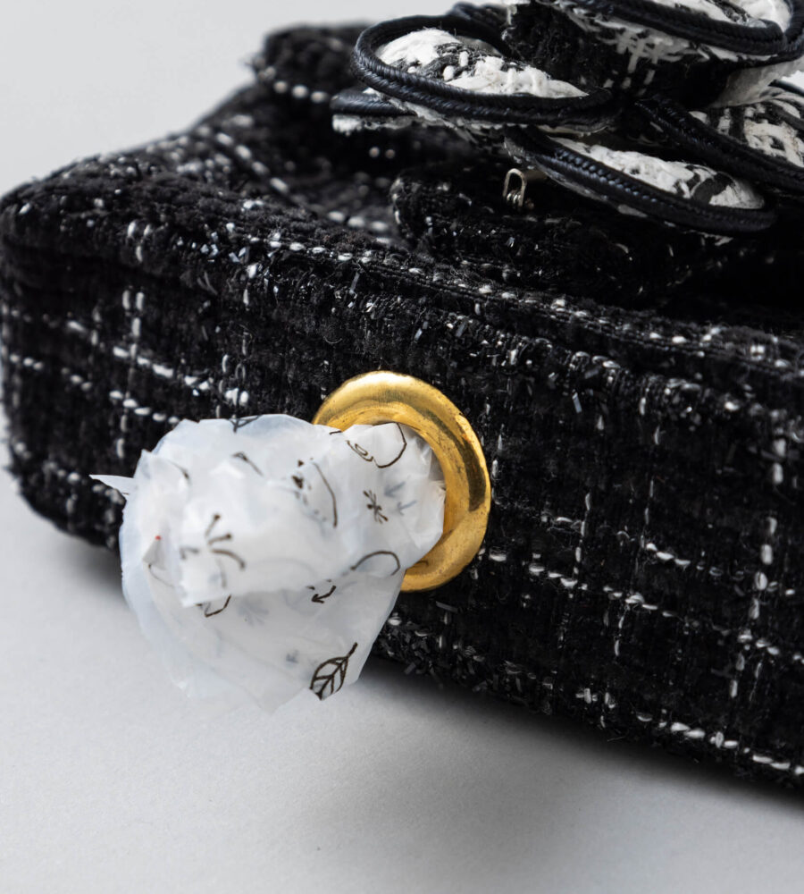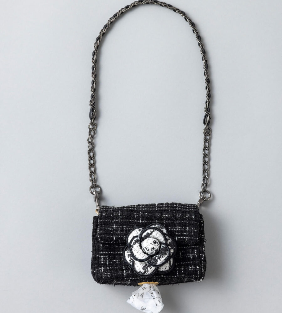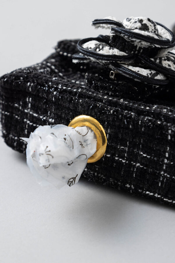 ブラックツイードにホワイトのカメリアが映える上品で洗練されたデザインのうんちバック。