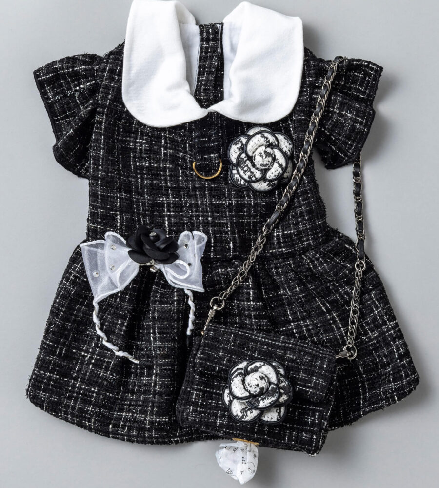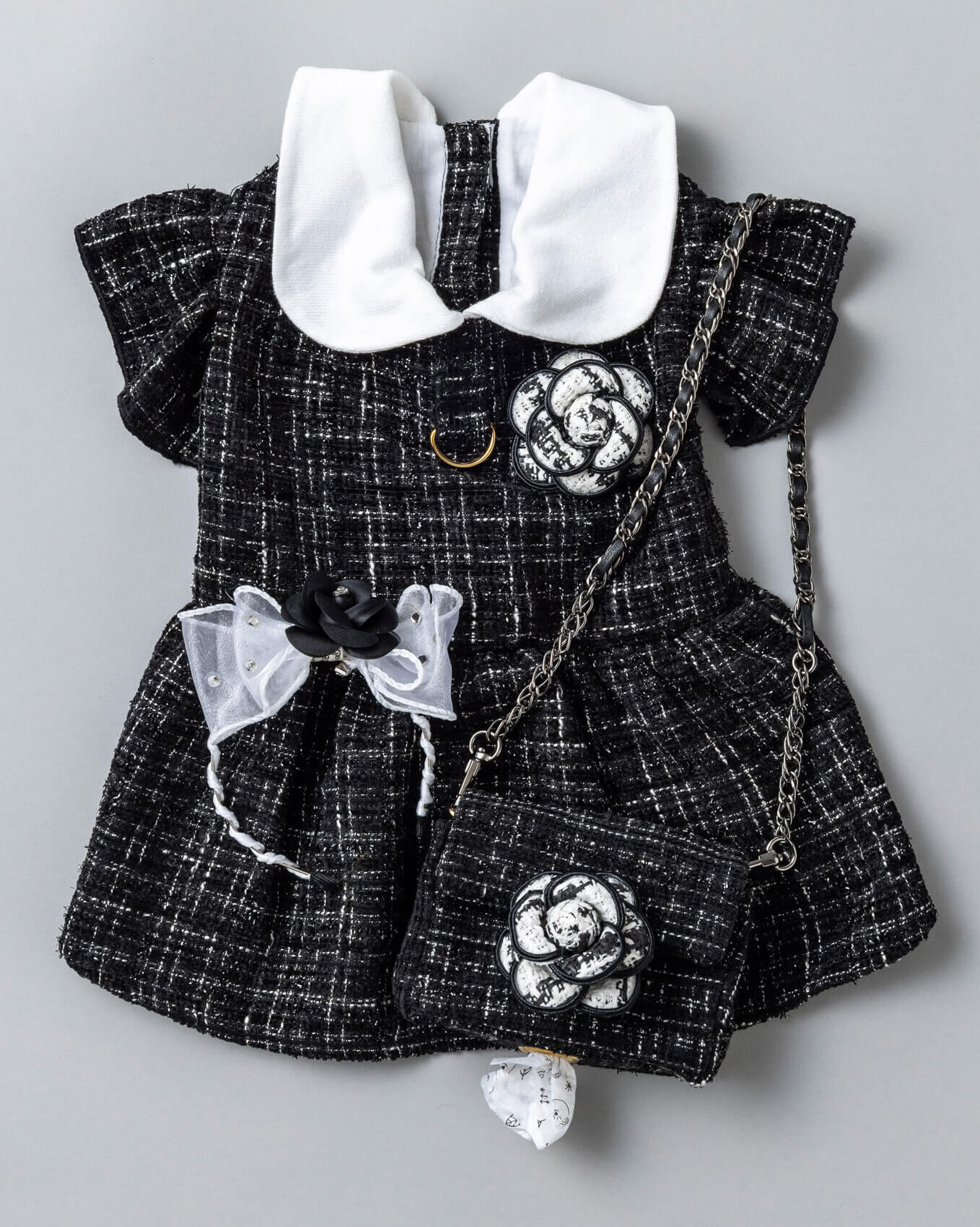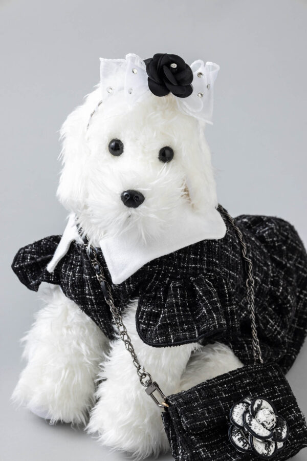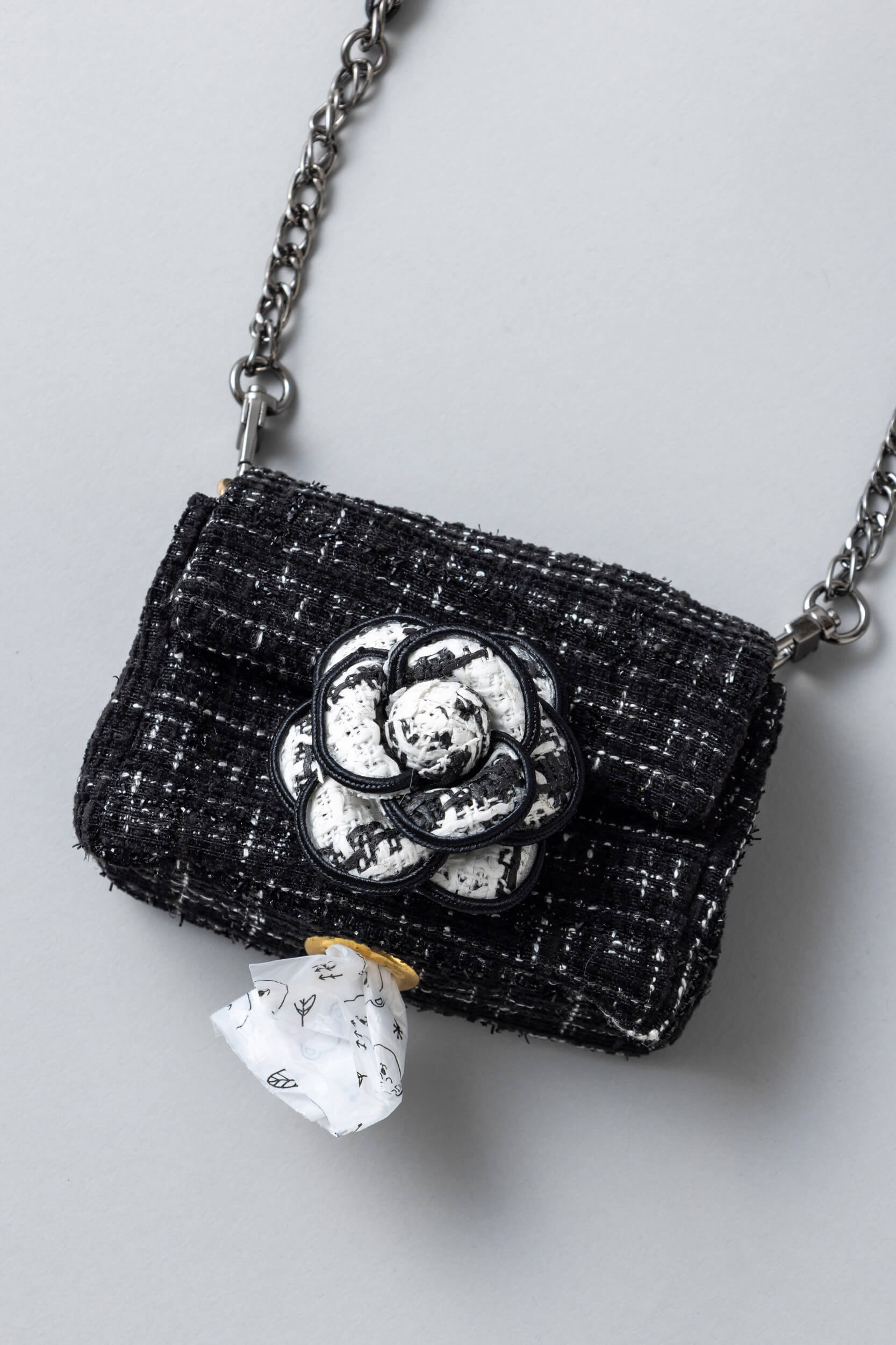 ブラックツイードにホワイトのカメリアが映える上品で洗練されたデザインのうんちバック。