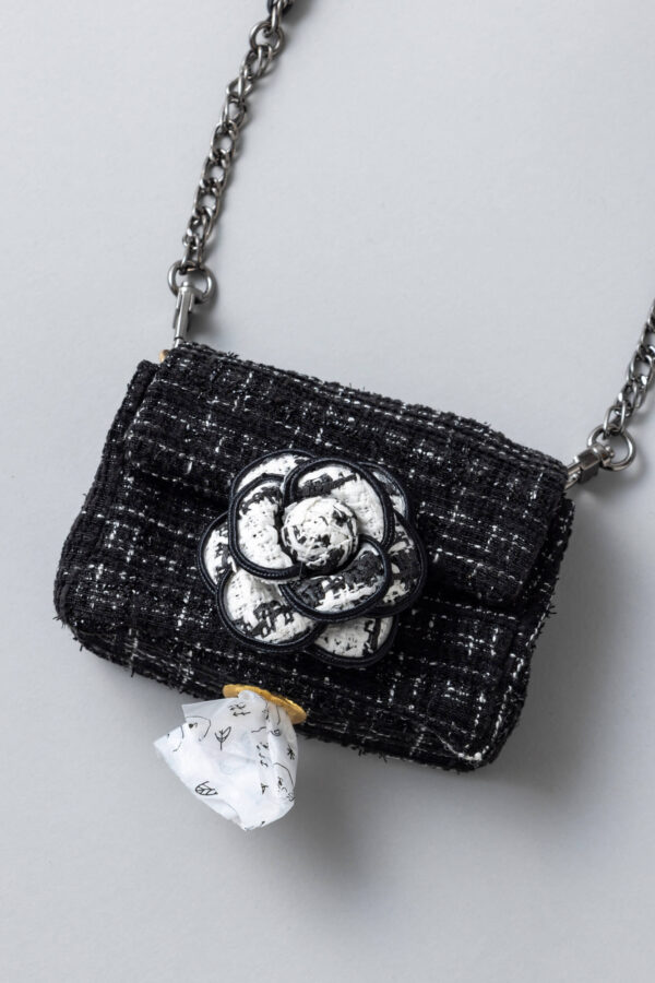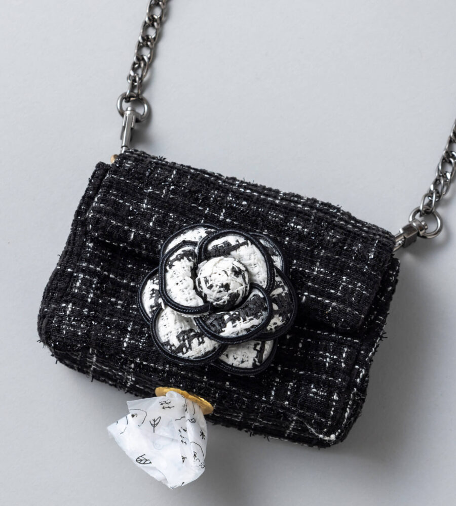 ツイード素材にカメリアチャームをあしらった高級感たっぷりのうんち袋収納バッグ。